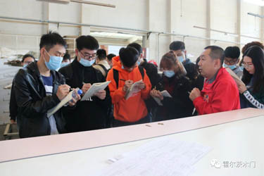 管玲超、韩磊带领师生一行参观展厅及工厂。期间,同学们结合了自己所学的知识踊跃提问,一番热烈的交流后,对霍尔茨木门家居产品技术及生产过程有了更深入全面的了解。