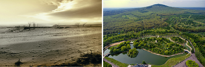左图为治理前,山西省右玉县随处可见的荒凉沙地(资料照片);右图为生机盎然的山西省右玉县小南山森林公园(新华社记者曹阳2018年8月7日无人机拍摄)。新华社发