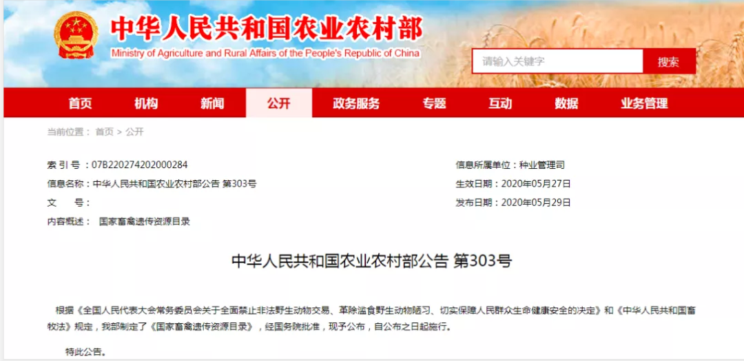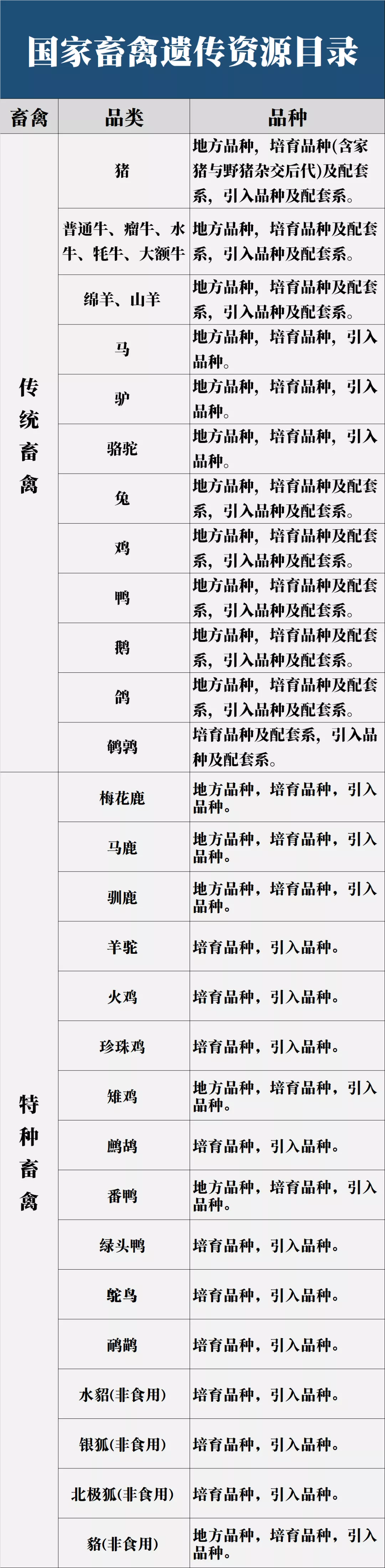 2020年05月27日,农业农村部公布《国家畜禽遗传资源目录》(附后)