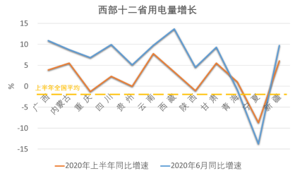 亮点三:西部地区用电领涨全国,西部大开发新格局顺利起步 西部地区用电量增长引领全国,表明全面建成小康社会将圆满完成。上半年,西部十二省份用电量合计同比增长2.9%,高出全国平均4.2个百分点。其中,云南、新疆、甘肃、内蒙等四省用电量增速较高,均超过5%。尤其二季度以来,西部地区用电量加速反弹态势更加显著,4月、5月、6月分别增长4.2%、5.9%和7.0%。其中,6月,西藏、广西、四川、新疆、云南、甘肃等六省用电量增长均超过或接近10%;甘肃、重庆、陕西、新疆、青海、广西等六省增速都高于去年同期。上半年西部地区用电量的快速增长,体现出西部各省份经济活动和社会发展的强大动力。在新时代推进西部大开发形成新格局战略的指引下,2020年西部地区必将与全国一道全面建成小康社会,步入高质量发展快车道。  图4 西部各省用电量增速