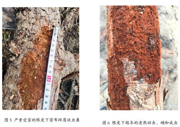 据调查,长林小蠹在烟台主要危害日本黑松根系,以成虫和幼虫钻蛀取食寄主根部,可先期侵害亚健康树木,携带伴生真菌协同危害寄主树木。长林小蠹危害隐蔽性强,地上部分无明显可辨的危害特征,钻蛀坑道主要集中在树干基部和根部。成虫可从土表直接钻入根部危害,单一蛀道可长达1.7米。
